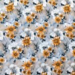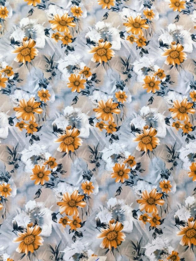 Amber Bloom combines serene blue-gray tones with striking mustard and white floral accents, perfect for refined summer attire.