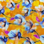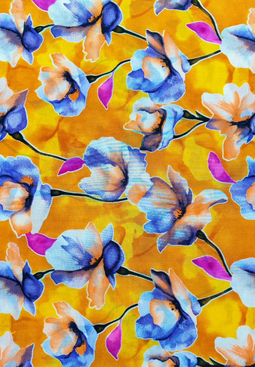 Golden Bloom Lawn is a vibrant floral display of electric blue and peach petals against a rich golden base. Bold and bright, perfect for standout summer looks.- Fabric: Lawn