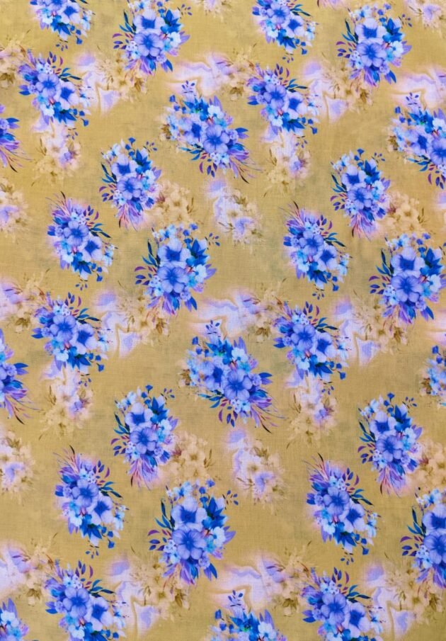 Lavender Mist captures the softness of summer with delicate clusters of blue and lavender florals on a pastel yellow lawn base. A graceful fabric choice for summer days.- Fabric: Lawn