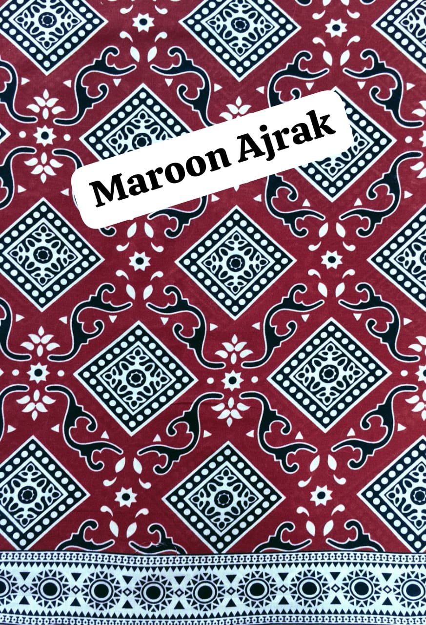 Celebrate heritage with our Maroon Ajrak Cotton Fabric. This timeless print features a classic combination of maroon, black, and white in traditional Ajrak motifs. Perfect for cultural outfits, casual wear, or styling ethnic kurtas.- Width: 40 inches