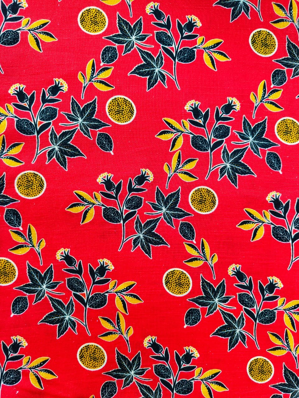 Embrace bold style with this vibrant red khaddar fabric featuring dramatic black leafy motifs and yellow citrus dots. Perfect for those who love standing out with color!- Fabric: Khaddar