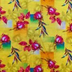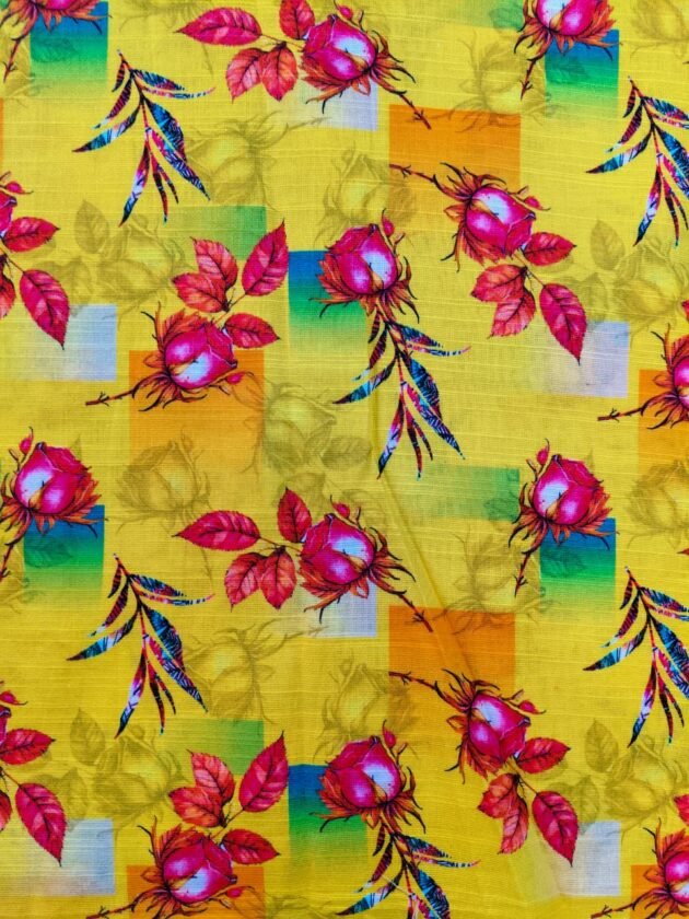 Sunset Bloom is a vibrant and colorful Khaddar fabric perfect for summer styles. It features bold pink rose buds, vivid leaves, and soft geometric accents on a sunshine yellow base.- Fabric: Printed Khaddar